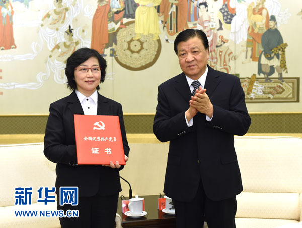 3月2日,中共中央政治局常委、中央书记处书记刘云山在北京人民大会堂亲切会见邹碧华同志先进事迹报告团成员并讲话。这是刘云山向邹碧华亲属颁发中央组织部追授邹碧华同志的“全国优秀共产党员”证书。新华社记者 饶爱民 摄