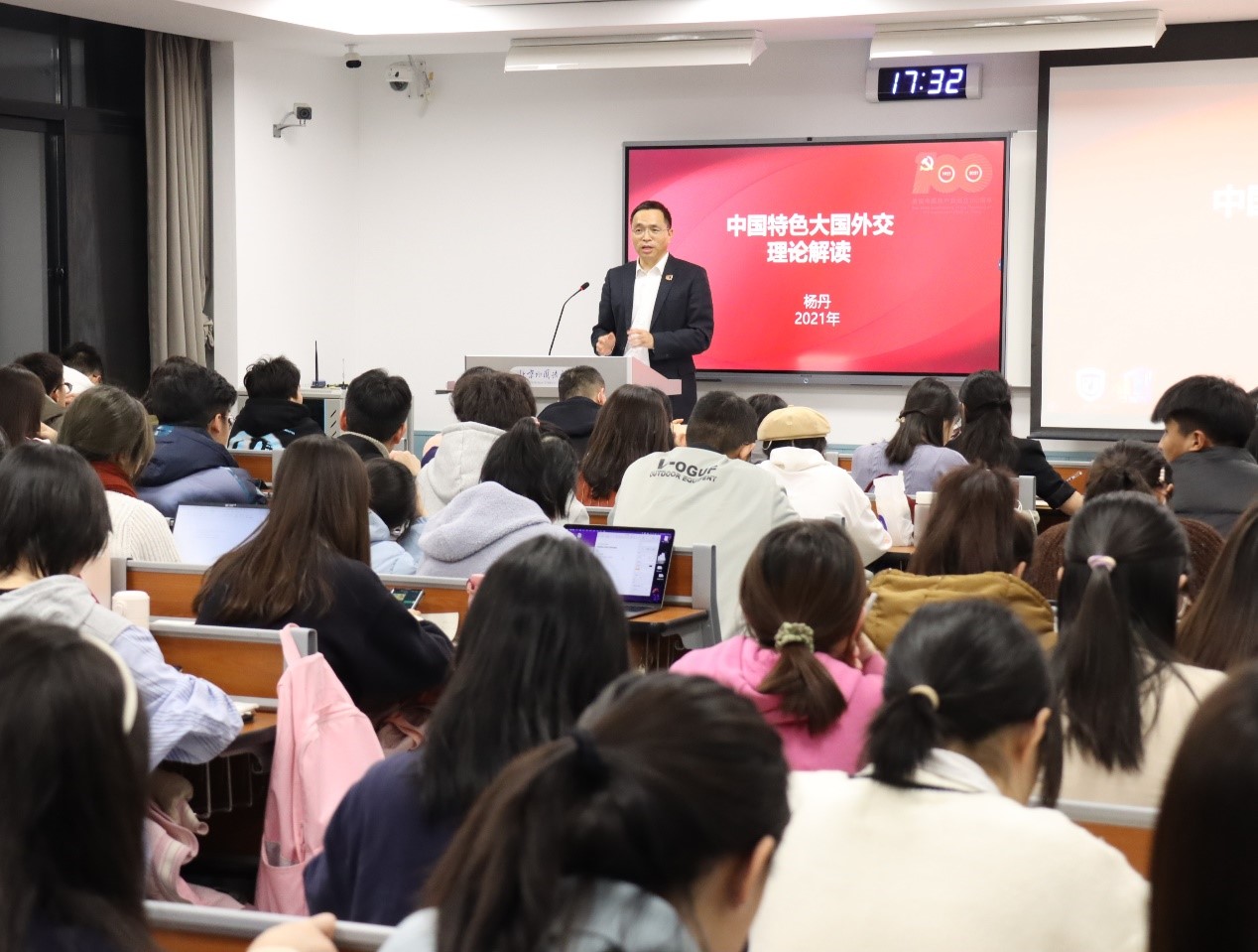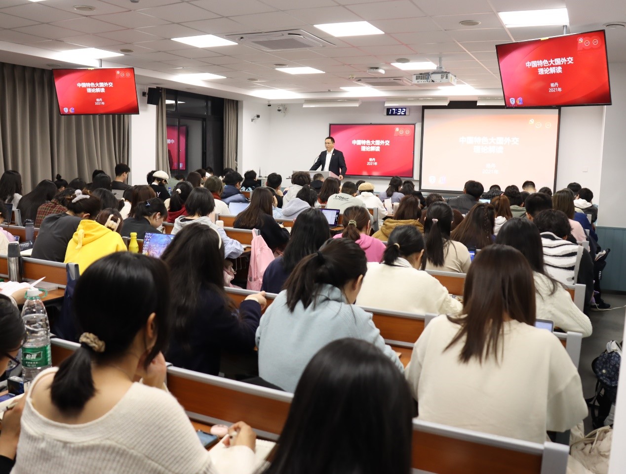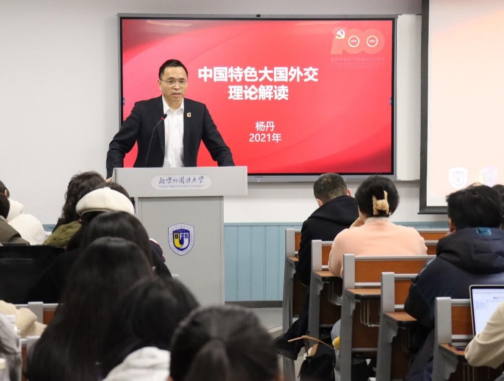 12月8日,bv伟德国际1946校长、党委副书记杨丹教授在逸夫楼为国际商学院2021级本科生讲授了题为《中国特色大国外交的理论解读》的形势与政策专题课。