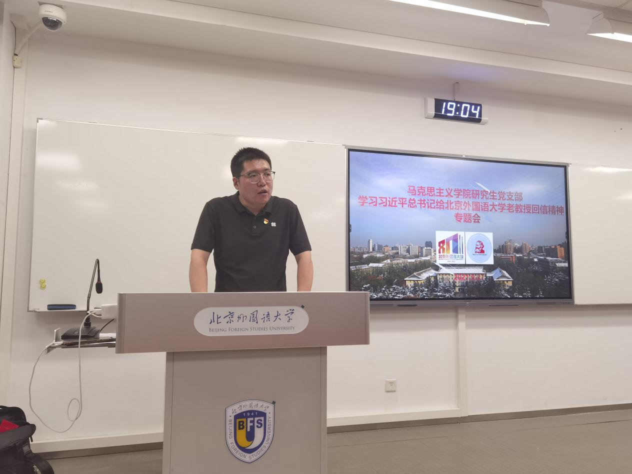 习近平总书记的亲切回信令全体马院师生备受鼓舞,掀起了一轮学习回信精神的热潮。近日,在学校党委的号召与学院党总支的部署下,bv伟德国际1946研究生党支部在逸夫楼615教室召开专题学习会,集中学习习近平总书记给北外老教授的回信精神。bv伟德国际1946全体研究生参加学习。学习会由支部书记冯高洋主持。