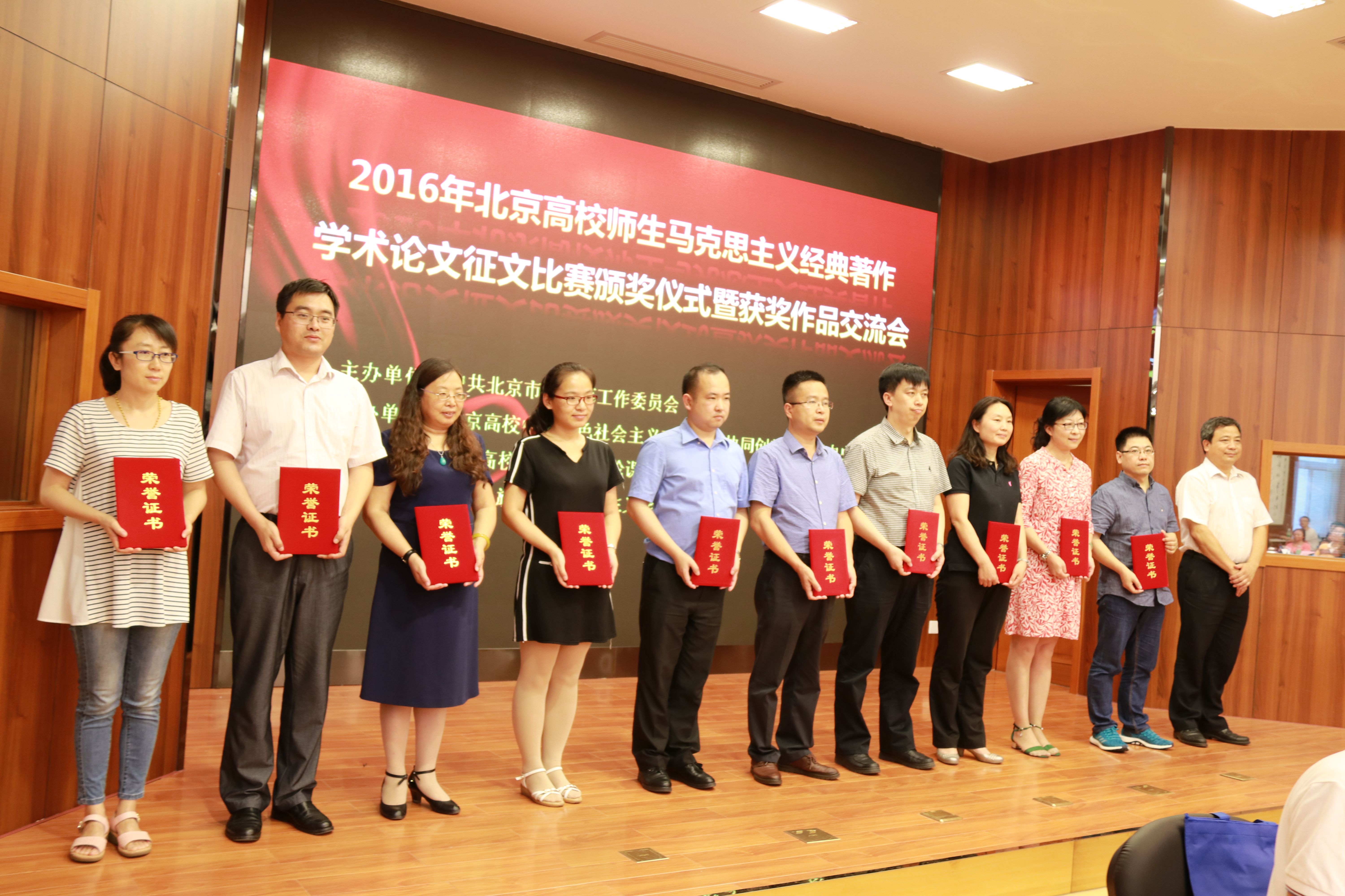 近日,2016年度北京高校师生马克思主义经典著作学术论文征文比赛结果揭晓,我校师生所参评的17篇学术论文在此次征文中获得奖项。其中,教师和博士组,我校荣获一等奖一名,二等奖三名;硕士生组,我校获二等奖一名,三等奖两名;本科生组,一等奖两名,二等奖两名,三等奖六名。同时,我校因在此次学术论文征文比赛中组织工作得力突出,获得优秀组织奖。6月26日,论文比赛颁奖仪式暨获奖作品交流会在中央民族大学隆重举行。党总支书记祝和军作为获奖作者在大会上做了交流发言。