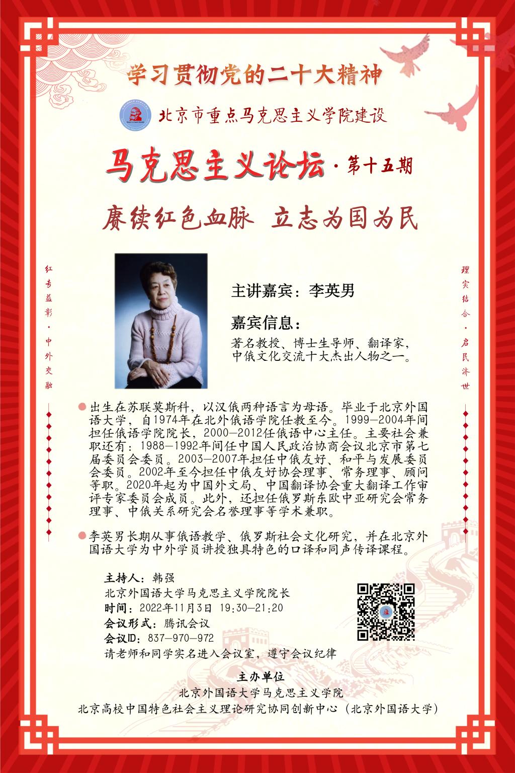 主讲嘉宾:李英男 著名教授、博士生导师、翻译家,中俄文化交流十大杰出人物之一