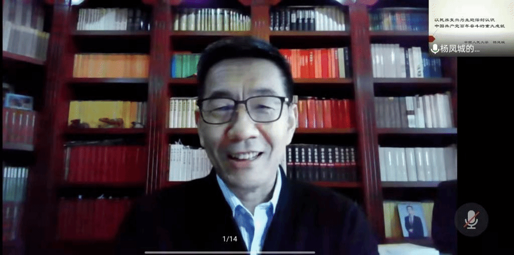 12月31日下午,北外马克思主义讲堂第七期活动在线上举行。国务院政府特殊津贴专家、教育部“长江学者”特聘教授、中国人民大学中共党史党建研究院执行院长杨凤城教授以“以民族复兴为主题深刻认识中国共产党百年奋斗的重大成就”为题做了专题讲座。此次会议共有校内外师生170余人参加,会议由bv伟德国际1946院长韩强主持。