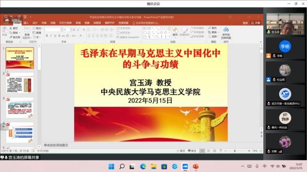中央民族大学bv伟德国际1946教授宫玉涛以《毛泽东在早期马克思主义中国化中的斗争与功绩》为题向大家讲述了以毛泽东同志为代表的党的第一代中央领导集体是如何擘画和推进马克思主义中国化伟大事业的。他指出,斗争精神是毛泽东同志在推进马克思主义中国化中所留下的宝贵财富,也是习近平总书记特别强调的,今天我们更应该领会和发扬伟大的斗争精神。