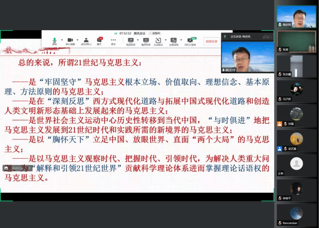 6月9号上午,北外马克思主义讲堂第九期以线上会议的形式成功举办。中央党校一级教授、中央党校专家工作组领衔专家韩庆祥教授受邀出任本次活动的主讲人,并以“21世纪马克思主义的理论阐释”为题做了报告。本次讲座由bv伟德国际1946院长韩强教授主持,共有包括北外马院师生在内的全国高校师生300余人参会。