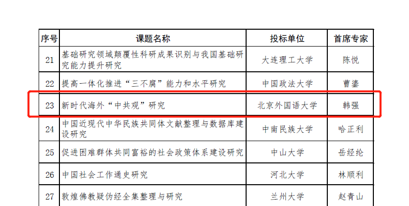 2022年12月29日,教育部办公厅发布《关于2022年度教育部哲学社会科学研究重大课题攻关项目立项的通知》(教社科厅函[2022]50号),根据《通知》,2022年度教育部哲学社会科学研究重大课题攻关项目共有51项批准立项,我院韩强教授作为首席专家领衔申报的《新时代海外“中共观”研究》成功获批立项,项目编号:22JZD023。