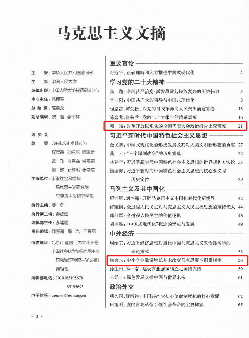 日前,我院韩强、尚会永两位教授文章《改革开放以来党的全国代表大会政治报告比较研究》《中小企业数量增长并未改变马克思资本积累规律》被人大复印资料《马克思主义文摘》(2023年第2期)全文转载。