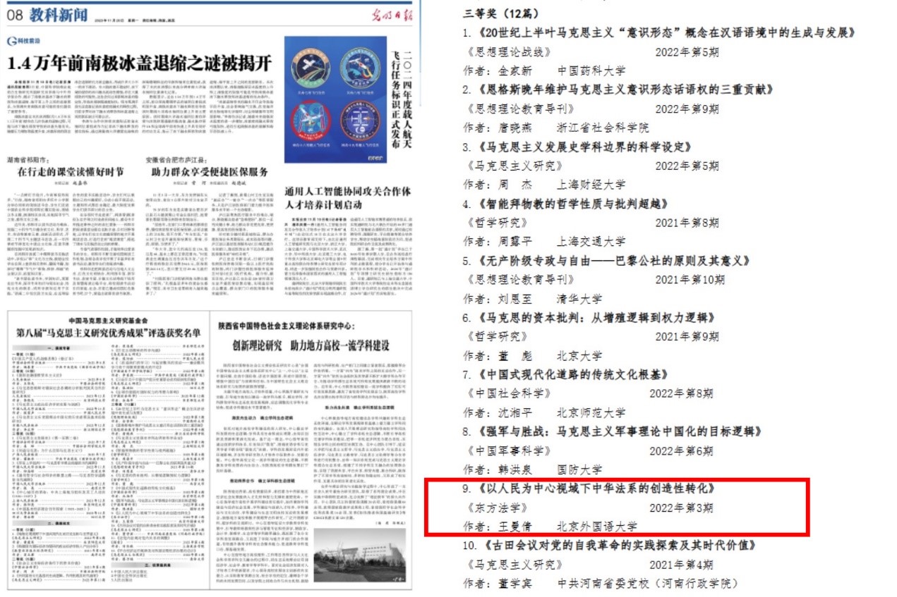 近日,中国马克思主义研究基金会公布了“第八届马克思主义研究优秀成果奖”获奖名单,全国共有20篇论文获奖,其中一等奖2篇、二等奖6篇,三等奖12篇。我校bv伟德国际1946教师王曼倩的论文《以人民为中心视域下中华法系的创造性转化》获三等奖。