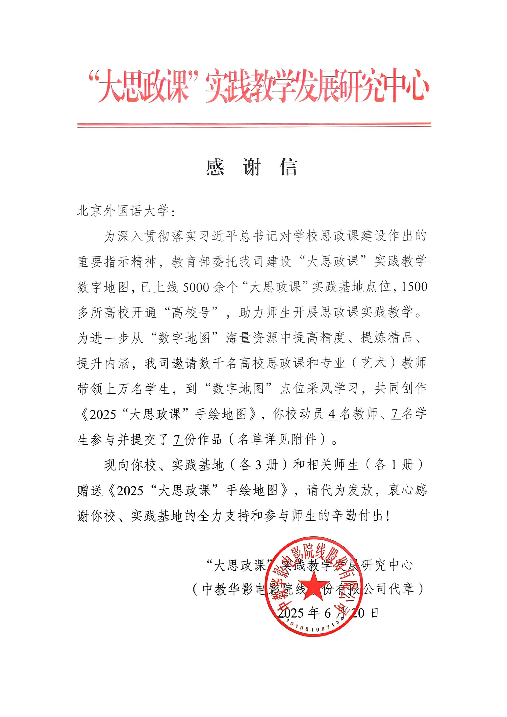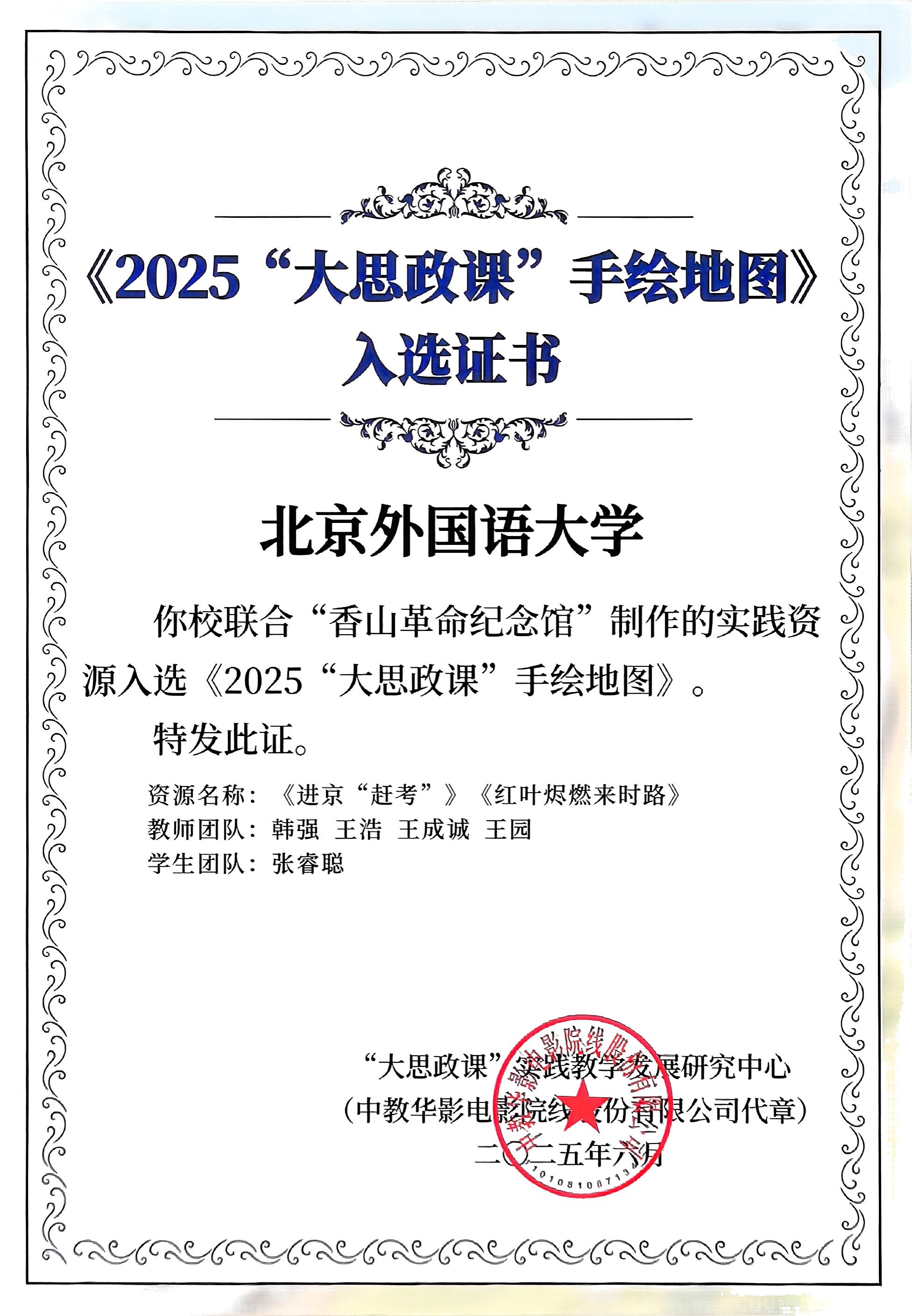 近日,“大思政课”实践教学发展研究中心向我校发来感谢信,对我校师生积极参与教育部委托建设“大思政课实践教学数字地图”项目表示感谢。我校马院教师团队带领来自不同学院的多名同学,通过点位采风,精心创作了7份手绘和视频作品。经专家评审,《香山纪念馆手绘元素》、视频《进京“赶考”》、《红叶烬燃来时路》,成功入选《2025“大思政课”手绘地图》。
