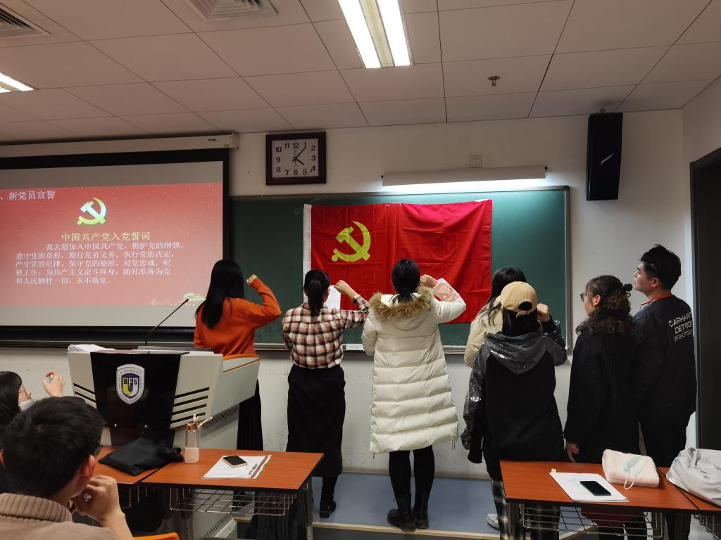 最后,新党员进行了入党宣誓。入党宣誓是人生中一次庄严的仪式,是党员政治生命开始的象征,是非常庄重而严肃的。他们面向党旗、举起右拳、进行宣誓,铿锵有力的誓言表达了他们对党的忠诚、对共产主义的追求和为党和人民牺牲一切的承诺。
