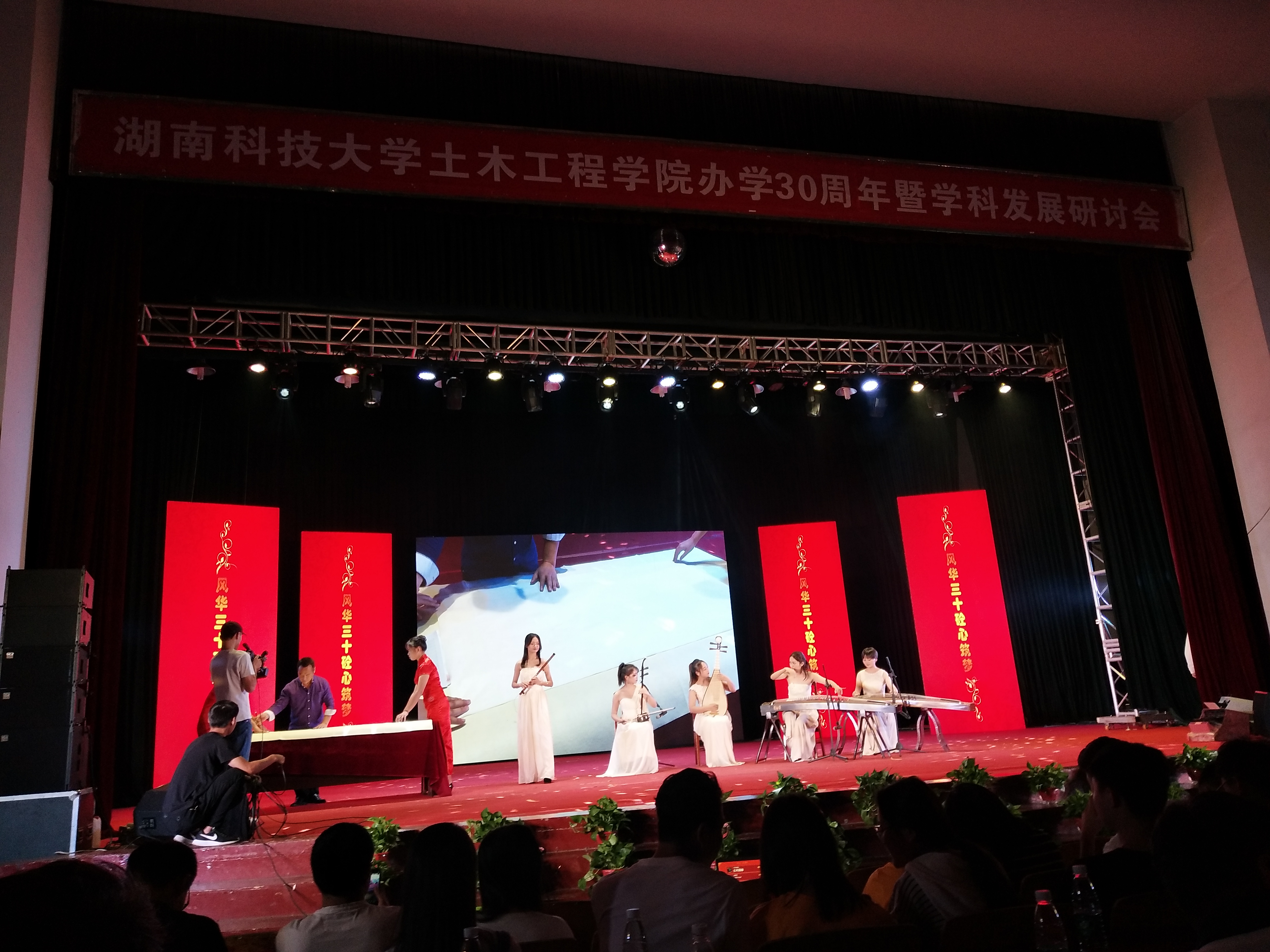 舞台忽暗,耳边传来一段悠扬典雅的器乐演奏,只见台上落座一排身着古装的表演者,为大家弹奏器乐,而随着器乐表演,舞台左侧的表演老师摊开宣纸,现场书法。音乐停,笔尖止,几个恢宏大气的书法字体“砼心筑梦”呈现在观众眼中,将舞台现场渲染的古色古香。除了歌舞表演,土木学院师生还为校友带来一幕幕追忆校园时光的情景剧和气贯长虹的诗歌朗诵——《科大土木,风华三十》,台下校友或鼓掌,或拿出手机录制视频,现场欢声一片。